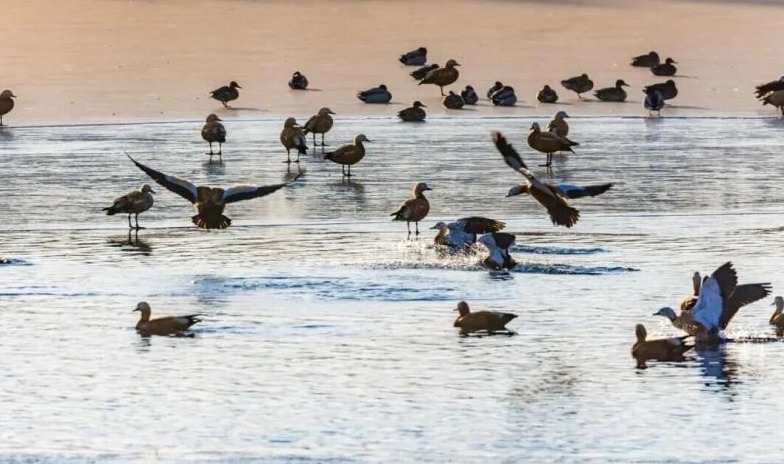 近日,記者走進(jìn)額濟(jì)納濕地公園,看到成群結(jié)隊(duì)的赤麻鴨時(shí)而俯身啄食水中浮游生物,時(shí)而在冰面與未封凍的水域間穿梭,給冬季增添了生機(jī)與活力。